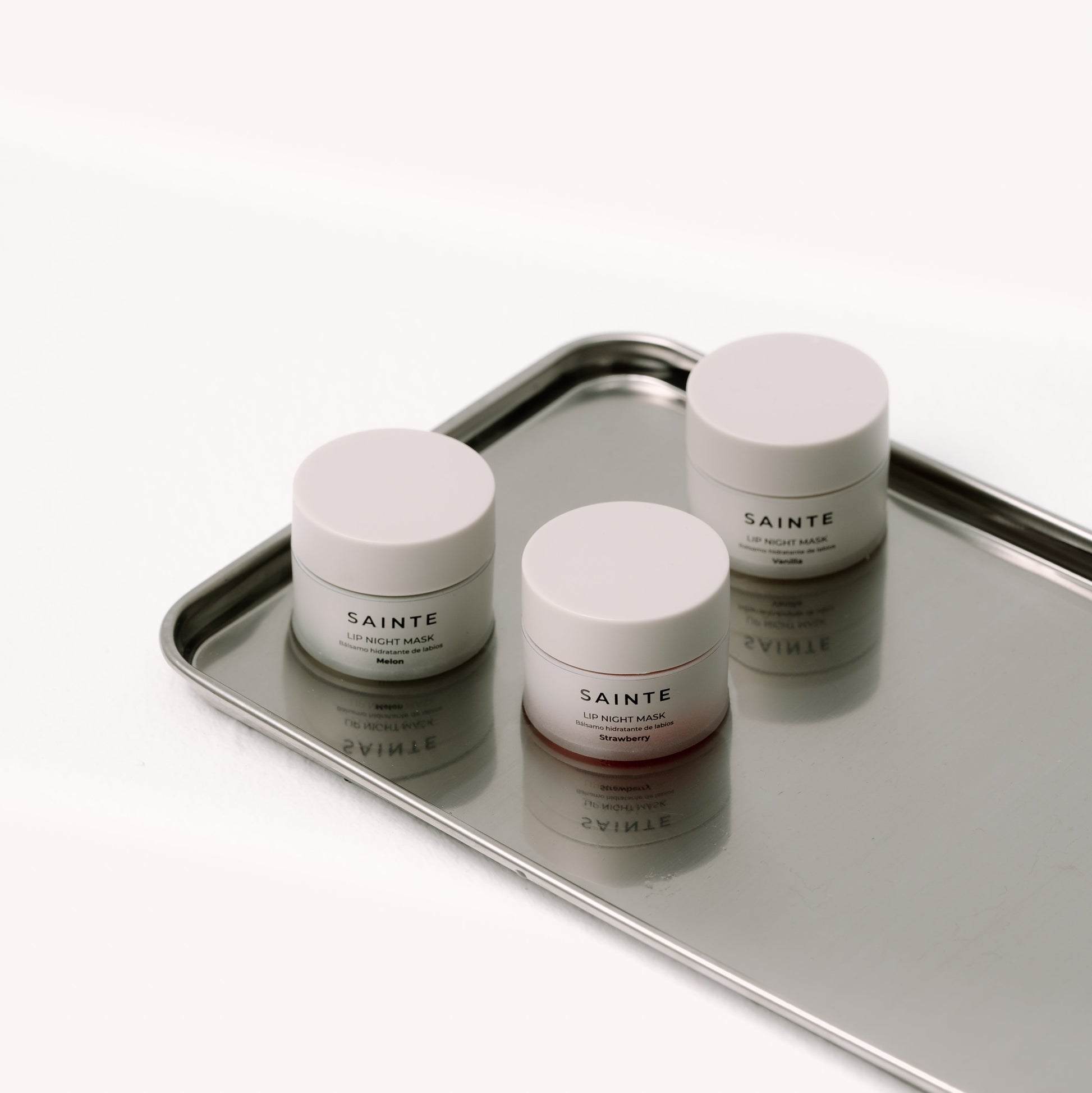 Pack con los tres sabores de los Sainte Beauty Hydrating lip treatments VANILLA, MELON &STRAWBERRY.